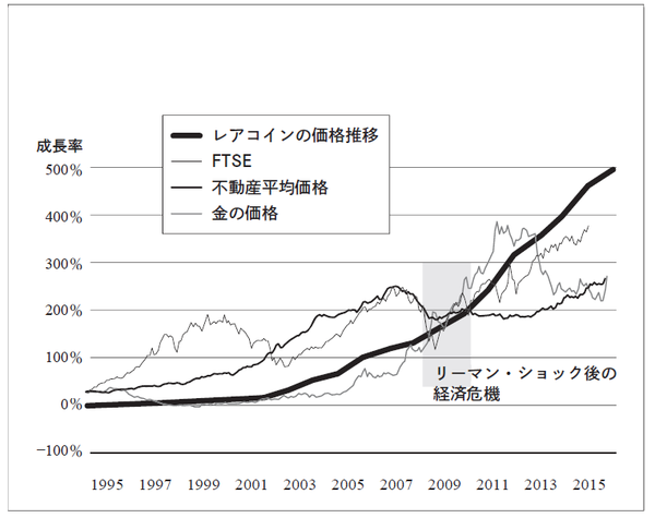 300年の価格推移を網羅したデータは残念ながら存在しませんが、イギリスにはSTANLEY GIBBONS社が作成している「GB200 Rare Coin Index」という指標があります。このデータは、イギリスで発行されたコインのなかで、とくに価値の高い200銘柄の直近20年間の価格推移を指標化したものです。この資料を参照すれば、イギリスの国内不動産の平均価格推移やFTSE(主要株価の合成数値)の株価指数、金の価格推移と併せて、人気銘柄の価格推移を確認することができます(図表2参照)。