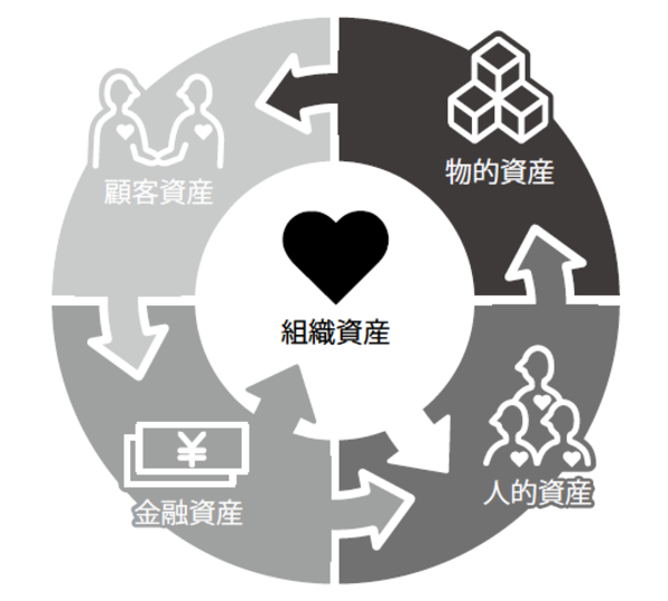 組織資産を中心に、人的資産→物的資産→顧客資産→金融資産と展開し、組織資産に戻るというように、ぐるぐると左回転して各々の資産が連動していく様子がよくイメージできるはずだ。