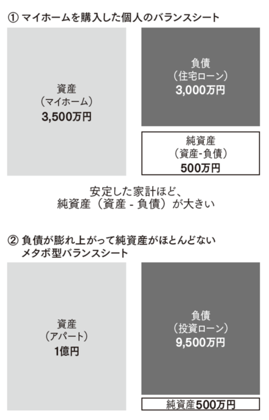 このように、借金で総資産を膨らませた投資は、「メタボ型」投資と呼ぶことができます。そのメタボ型投資のバランスシートが示す不動産経営は、大変リスクの大きい投資手法です。大食漢でたくさんの脂肪を貯め込み、いつ生活習慣病を発病してもおかしくありません。一刻もはやくダイエットする必要があります。つまり、脂肪である借金を返済する必要があるのです。