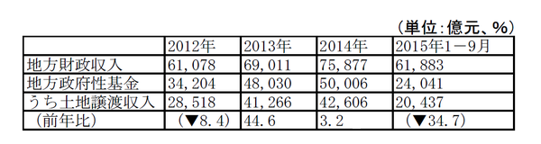 土地資源は、まさに地方政府が農地の土地収用、開発業者への転売を通じて獲得する土地譲渡収入という形で、重要な歳入減としてきたものだ(地方歳入の約4割)。しかし、土地譲渡収入は、その時々の不動産市場動向に大きく左右される。債務返済に充てる資金を調達しなければならないようなデフレ状況の時には、不動産市場も低迷している可能性が高い。実際、不動産市場が低迷した時期には、地方政府の土地譲渡収入の伸びはマイナス、または大きく鈍化している(参考1、2)。