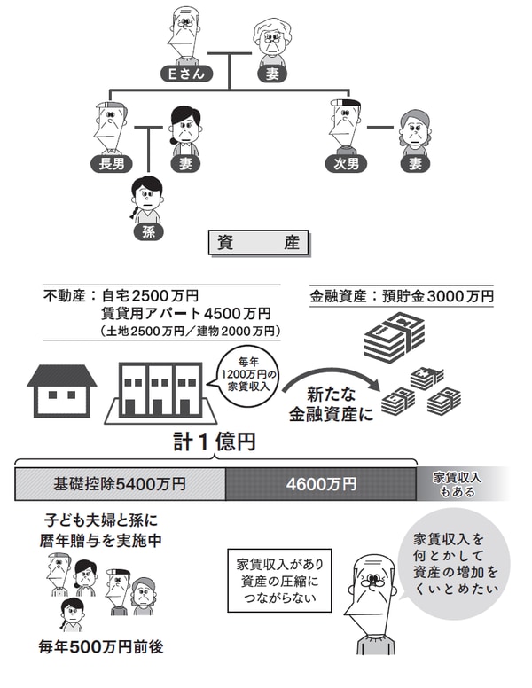 Eさんの資産は自宅と預貯金、それから賃貸用のアパート1棟を運営しています。これまで暦年贈与や贈与の特例を利用し、財産の圧縮をはかってきました。しかしアパートの家賃収入が毎年500万円あるため、贈与でキャッシュを減らしてもまた増えてしまい、資産が1億円から減りません。