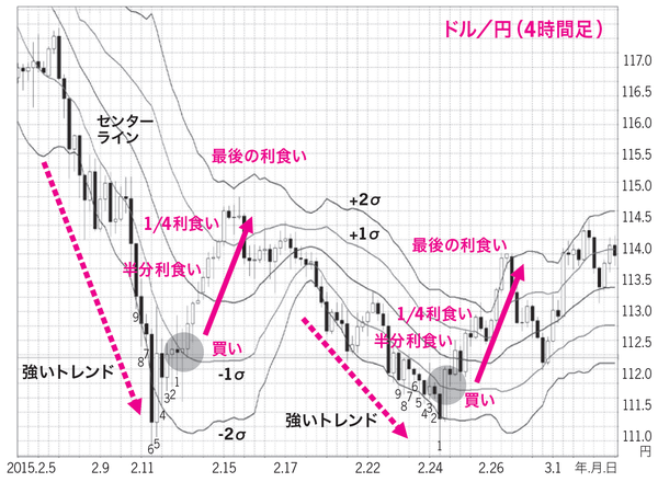 ローソク足終値が-1σを上抜けたら、その次の足で買い注文を出す。センターラインで半分利食い、+1σで4分の1利食い、+2σで最後の4分の1を利食い。