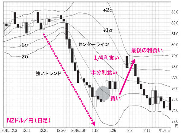 泰造 図表3の「NZドル/円の日足チャート」では、いったん-1σを上抜けても、その後数本のローソク足は横ばいですね。下髭が-1σまで伸びているローソク足もあります。