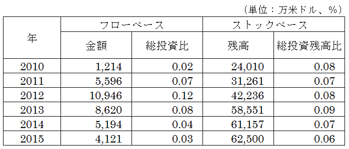 他方、中国の対朝投資は総額のみ対外直接投資公報年報の付表に記載がある。それによると、ストックベースでは2015年末は6.25億ドルで、中国の対外総投資残高の0.06%、フローベースでは2012年1億946万ドルと過去最高を記録した後、減少に転じ、2015年は4121万ドル、対外総投資のわずか0.03%に落ち込んでいる(図表)。両国間の投資は近年双方向で急激に縮小傾向にある。商務部は8月25日、8月に採択された国連新制裁決議に基づき、同日から、北朝鮮企業あるいは個人が中国で合弁企業、外資企業を新たに設立すること、および既存企業の増資を禁止する旨の公告を発出した。