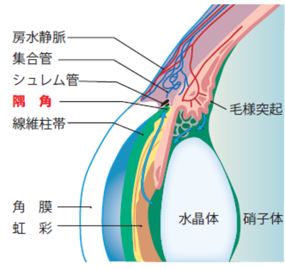 緑内障発作は、閉塞隅角によって引き起こされます。虹彩と角膜が接する隅角が狭くなると、房水が流れにくくなります(狭隅角といいます)。狭隅角が進行すると、隅角が詰まって房水が流れなくなるのです。隅角が閉塞すると、溜まった房水は虹彩を押し上げて、さらに隅角が狭くなります。この悪循環で、とうとう全く流れなくなります。