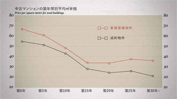 下記のグラフは、日本の中古マンションの築年帯別平均㎡単価です。横軸が築年数の推移、縦軸は㎡単価(単位:万円)、「新規登録物件」は新規に販売に出された中古マンションの築年数ごとの推移、「成約物件」は実際に取引された物件を指します。