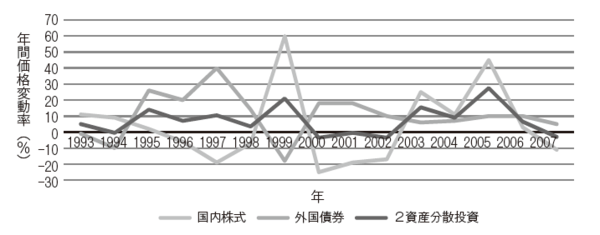 たとえば図表のように、国内株式と相関係数が小さい外国債券との分散投資を行うと、価格の変動性は低減します。