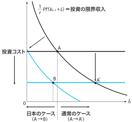 本来は図表2に示されるように、投資の限界収入(=投資を増やすことによって得られる収入の増分)が一定であれば最適投資額は点A′ へ変化して増加する。ところが日本では正確な計測は難しいものの、投資の限界生産性が低下していると考えられる。したがって、利子率を低くして、投資コストを引き下げても、最適な投資額は、点Aから点Bへと変化し、最適な投資額は、減少してしまう。