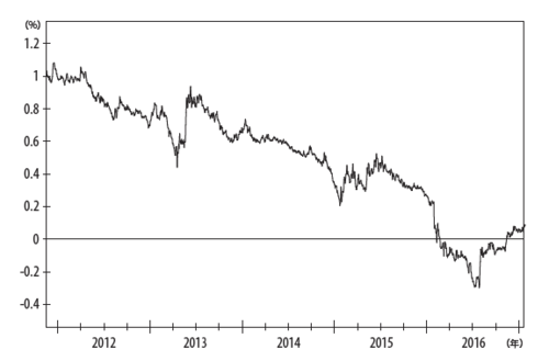 図表4に示した10年国債利回り推移のとおりである。金利がマイナスであるということは、例えば100円のお金を貸した人が98円しか満期のときにもらえないと、これがマイナス金利である。このことが国債に対する需要を減らした。