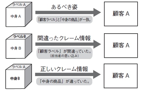 トラブルの事実を正しく把握していないと、その後の対応を間違えるかもしれません。この例でいうなら、顧客に間違って届けた商品だけでなく、在庫品も中身の商品が違っている可能性があります。もしそうなら、同じトラブルを繰り返すことになります。
