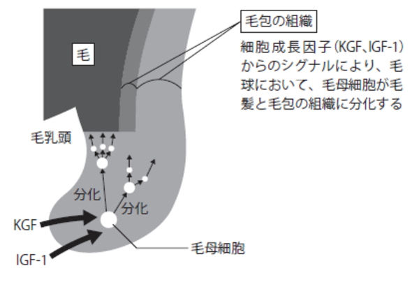 すなわち、毛包基部の毛母細胞が、裏打ちする毛乳頭からの細胞成長因子(KGF、IGF-1)からのシグナルを受けることで細胞分裂し、毛髪と毛包の組織に分化します。この過程で毛は上へ上へと伸びるとともに毛母細胞が角化して、硬い髪の毛へと育っていくのです(図表2参照)。