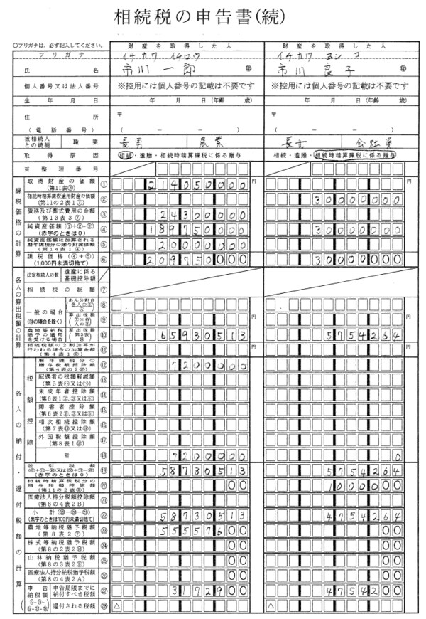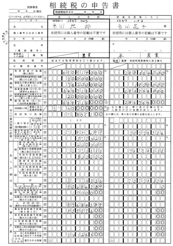 (注)イ:本例では、算出税額のほうがの軽減額より少ないため、実際の軽減額は算出税額が限度となります。これは、配偶者花子の算出相続税額33,162,732円(申告書第3表⑨)と、農業相続人の納税猶予の基となる税額にかかる花子への按分額40,613,604円(申告書第3表⑫)の合計額73,776,336円(申告書第3表⑬)が、⑤税額軽減額より少ないからです。