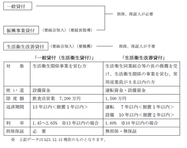 「一般貸付(生活衛生貸付)」と「生活衛生改善貸付」では前者が要担保・保証人の制度であるのに対して、後者は無担保無保証となっています。