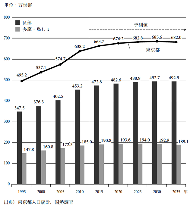 とくに東京は、他の地域からの人口流入が続いています。以下の図表1、図表2は、国勢調査のデータに基づき、東京都が推計したものです。区部の世帯数を見ると、伸び率は低くなるものの、2035年まで世帯数の増加が続き、493万世帯に達すると予測されています。2015年時点と比較すると、約20万世帯の増加となる見込みです。