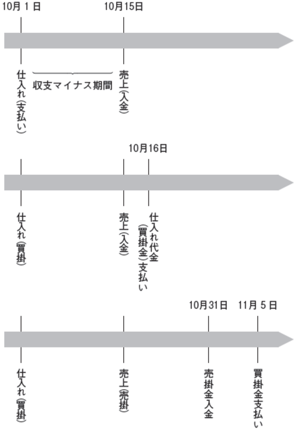 仮に、10月1日に仕入れ、10月15日に売り上げた場合、10月1日から15日までの間、収支はマイナスです。しかし、10月1日の仕入れを買掛にして、その支払日を10月16日にすれば、この取引における「収支マイナス期間」はゼロになります(以下の図表を参照)。