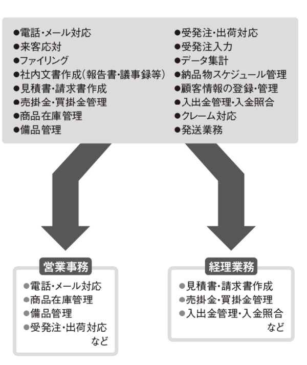 経理担当者は意外に多くの営業事務を兼任しています。営業事務とは、営業マンのサポートです。具体的には、商品の受発注管理、在庫有無や納期の管理などがこれにあたります。