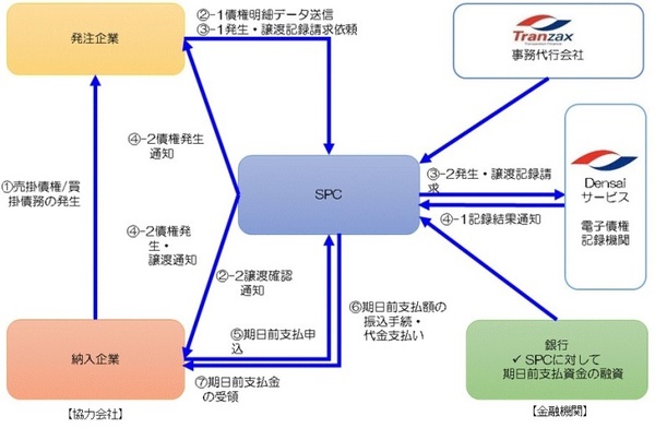 当然、サプライヤーは資金繰りに困る。銀行で手形を割り引いてもらう場合には2~3%ほどの金利コスト等がかかることもございます。ところが、当社のサプライチェーン・ファイナンスを導入すれば最短で支払いサイトを20日ほどに短縮できてしまいます。サプライヤーの売掛債権(発注企業の買掛債務)を電子記録債権化して、Tranzaxが発注企業毎に設立したSPC(特定目的会社)が買い取る。早期資金化ニーズに応じ、買い取り代金をお支払いする。
