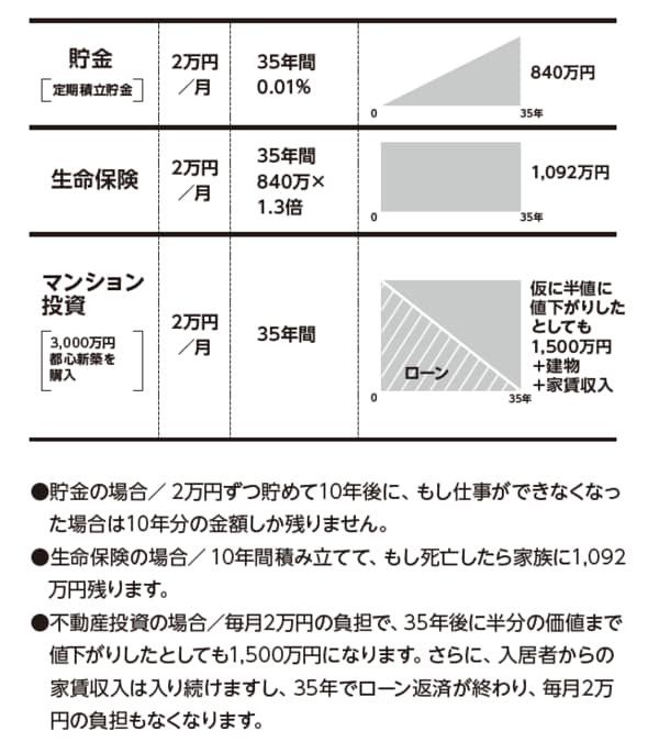 たとえば、毎月2万円を貯金、生命保険の積立、不動産にそれぞれ投下すると、35年後はどうなるか下記図表のようにシミュレートできます。