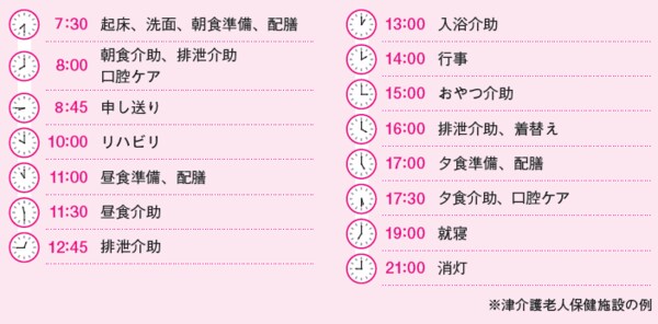 そのため、医師や看護師が常駐し理学療法士や作業療法士などによる専門的なリハビリ、また、栄養管理・食事・入浴などの日常サービスまであわせて提供します。介護施設のなかでもさまざまな専門職が働く職場です。