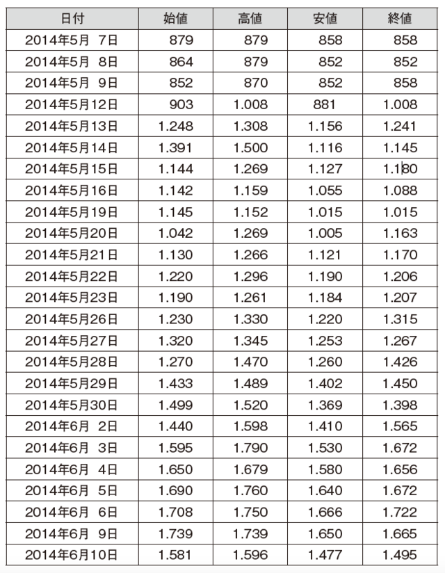 ●暴騰した材料:2014年5月9日に、組み込み機器向けの自社のネットワークプラットフォームソリューションが、ローム社製inside規格準拠ベースバンドLSIに採用されたと発表。これによって、家電などの機器をコンセント経由で簡単に、ホームネットワークやインターネットに接続できるようになると期待される。
