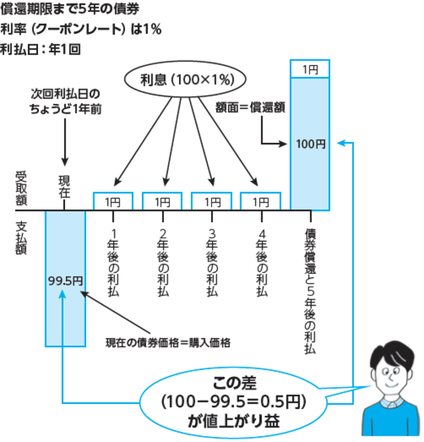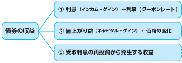 債券で資金を運用したときのすべての収益は、図表1に示したように3種類あります。しかし、ここではわかりやすさを優先し、「単利※」の考え方で利回りを説明していきますので、「③受取利息の再投資から発生する収益」は利回り計算に算入しないこととします。したがって、債券の収益は、①利息(インカム・ゲイン)と②債券価格の値上がり益(キャピタル・ゲイン)と考えてください。