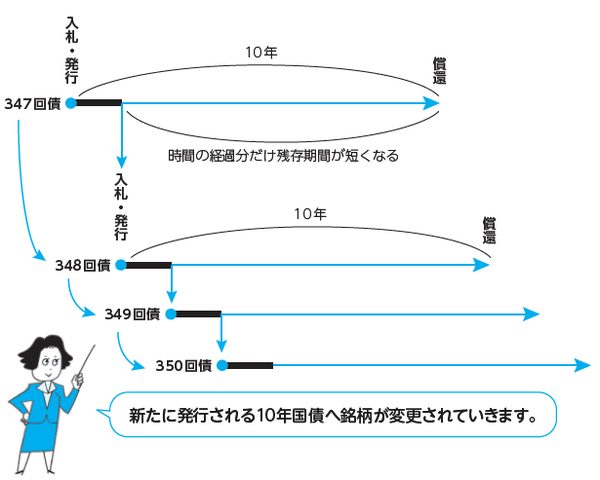 そうすると、たとえ同一の債券であっても1年前と同じ性質を持っているとはいえなくなります。このようなことを避け、「10年債」としての性質を維持するために、長期金利として参照される10年国債は、新しく発行されるたびに、最新の銘柄に入れ替えられています。