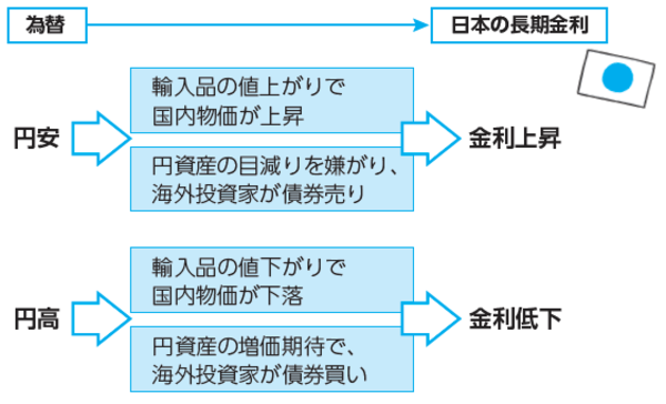 また、円安になると、海外投資家が日本の債券を外貨に換算するときに価値が目減りします。円安は海外投資家の債券売りを促し、金利上昇圧力となります。