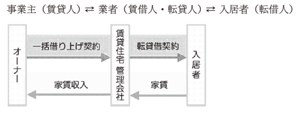 管理会社は相場の賃料にて賃借人(転借人)との間で賃貸借契約(サブリース契約)を締結する。