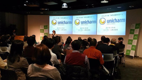 ユニ・チャームへの投資を開始して3年ほど経過した2013年12月。コモンズ30塾で過去6回開催しているテーマ『女性の活躍セミナー』の栄えある第1回に、ユニ・チャーム(旭化成さんにも同時に参加していただきました)をお招きしました。まだまだ”女性活躍”というキーワードが世に定着したとは言い難い時期ですが、注目度は高く、100名近い参加申込がありました。