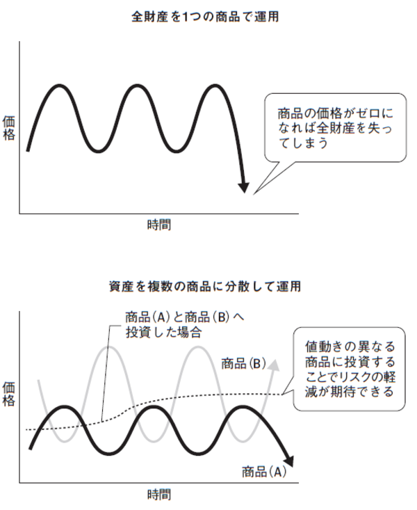 資産運用に関しても同じようなことが起こりえます。全財産を1つの投資商品で運用していたら、たとえば預貯金全額でA社の株式を購入していたとしたら、A社が倒産してしまったような場合には株価が暴落し、全財産を失うことにもなりかねません。