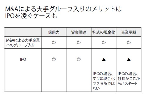 一方、M&Aによって大手企業のグループ入りをする場合は、「信用力強化」や「資金調達」に加え、「株式の現金化」もでき、M&Aと同時に自身は経営から手を引いて、譲受先の企業から経営者を派遣してもらうこともできるなど、一気に多くの問題を解決することができます。そういったことからM&Aを「プチ上場」と表現することも多いのです。IPOが自力成長だけであるのに対して、M&Aによる大手企業のグループ入りは譲受企業との事業上の相乗効果(シナジー)もあり、IPOよりもM&Aのほうが、株価が高くなる傾向にあります。