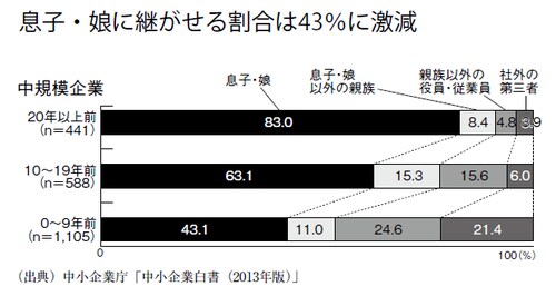 2014年の帝国データバンクの調査によると、中小・中堅企業の3分の2にあたる65.4%の企業に後継者がいないという結果が出ています。これは中小・中堅企業の経営者だけの問題ではありません。日本経済にとっても、深刻な問題ではないでしょうか。
