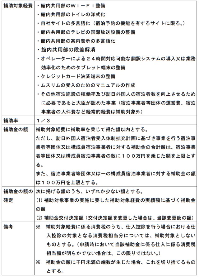 今回ご紹介する補助金は、訪日外国人旅行者の急増により発生している課題を解決するため、「宿泊施設インバウンド対応支援事業」、「交通サービス利便向上促進事業」、「交通サービス調査事業」、「地方での消費拡大に向けたインバウンド対応支援事業」を対象として補助金の交付を行うことにより、訪日外国人旅行者の受入環境整備を行うための緊急対策を促進することを目的としています。