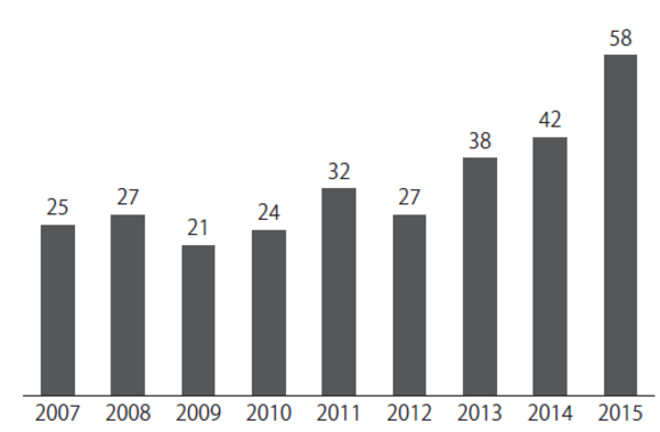 図表は、東京商工リサーチが発表している「不適切な会計・経理を開示した上場企業調査」から作成したグラフです。日本国内の上場企業において、「不適切会計」に関するリリースを開示した企業数を集計したものです。