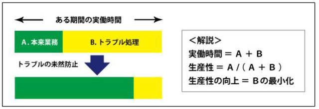 生産性を上げるためには、トラブル処理の時間を最小化しなければなりません。トラブル処理がゼロであれば、生産性は100%となります。