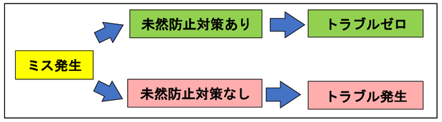 「未然防止」の考え方をミス発生未然防止対策あり未然防止対策なしトラブルゼロトラブル発生導入すれば、ミスしても実害のあるトラブルをゼロにすることができます。ここでいう「未然防止」には誰でもできる高い再現性があります。