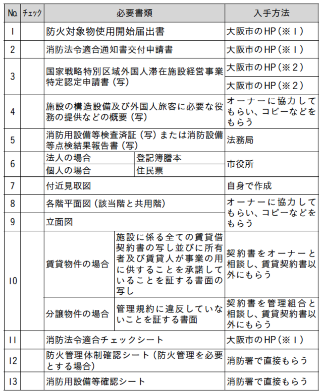 その他、消防関連の手続きで必要なものに関しては、チェックシートにまとめますので、これを使って確認していってください。また、大阪市内の消防署についての表も付けますので、市内の方は自分が運営する民泊施設がどの消防署の管轄になるか、確認してから訪問するようにしましょう。
