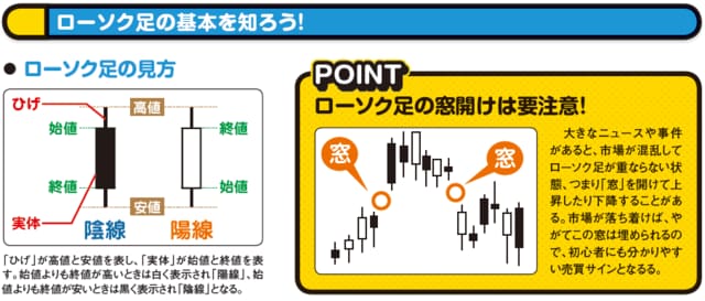 ローソク足は特徴のある並び方によって細かく分析することも可能ですが、ここでは詳しい解説はしません。ただし、初心者でも「窓開け」と「窓埋め」だけはしっかりチェックしておきましょう。