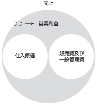 税理士「これはとてもシンプルなので、わかりやすいと思います。では、営業利益についてです。『営業利益』は、『売上』から『仕入原価』と『販売費及び一般管理費』を引いたものです。言い換えると、『売上総利益(粗利)』から『販売費及び一般管理費』を引いたものです。図で言うと、この部分です」