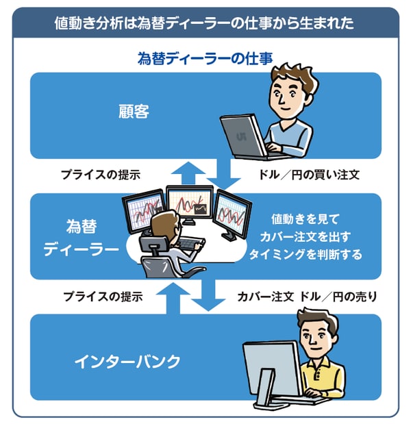 以前は、ポジションバランスなど価格の動向を判断するために、為替ディーラーは他の銀行の為替ディーラーと情報交換をしていました。しかし、今は、コンプライアンス上の問題など規制が厳しくなり、それができなくなっています。そのため、値動きから買い勢力や売り勢力の状況を読み取らなければ、利益が出せないのです。それが値動き分析です。