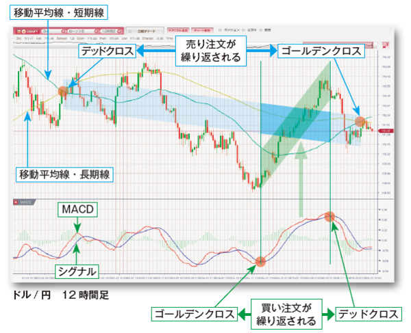[図表1]のチャートはドル/円の12時間足です。チャートには、移動平均線とMACDを表示しています。画面右側の部分では、MACDがゴールデンクロスし、その後、相場も上昇しています。「トレンド機能」でMACDを選択していれば、MACDがデッドクロスをするまで、買い注文が繰り返され、利益を積み上げることができます。一方、同じ期間で移動平均線を選んでしまうと、相場が上昇しているにもかかわらず、注文は「売り」になっているので含み損が増えてしまいます。