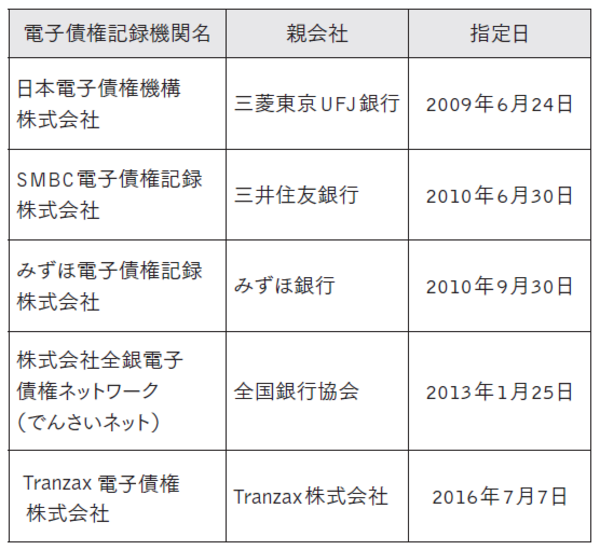 現在、電子債権記録機関には、三菱東京UFJ銀行系の日本電子債権機構株式会社、三井住友銀行系のSMBC電子債権記録株式会社、みずほ銀行系のみずほ電子債権記録株式会社、全国銀行協会傘下の株式会社全銀電子債権ネットワーク、そしてTranzaxグループのTranzax電子債権株式会社という、5つの機関があります。