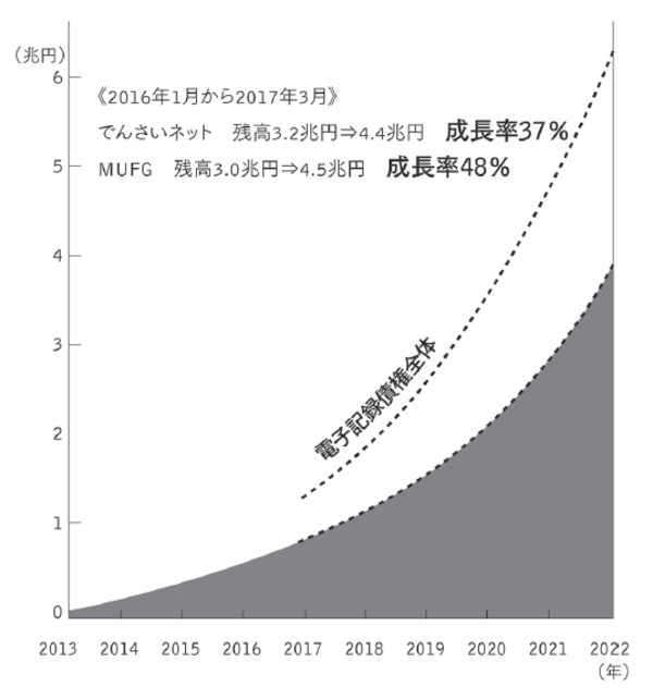 実際、全銀協系のでんさいネットの記録残高は2016年1月から2017年3月までに3.2兆円から4.5兆円へと約37%伸びました。三菱東京UFJ系の日本電子債権機構の残高も同期間で3.0兆円から4.4兆円へと約48%伸びています。5年後に60兆円の市場規模になるという予想も決して大袈裟ではないでしょう。