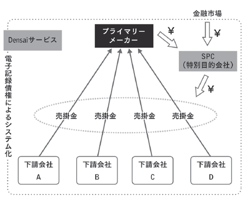 まず、筆者の会社が、親会社(大企業)とその取引金融機関の協力を仰いで、SPC(特別目的会社)を設立します。下請会社(中小企業)が部品や原材料を親事業者(発注企業)に納入して発生した電子記録債権を、このSPCが買い取ります。