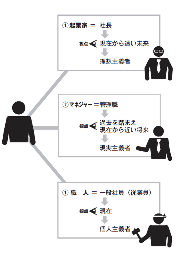 起業家という人格の人が文字どおり社長で、現在から遠い未来まで見通していて、理想主義者ということができます。「3年先、5年先の自社の未来像を考えて、やるべき仕事を選んでいく」といった発想です。