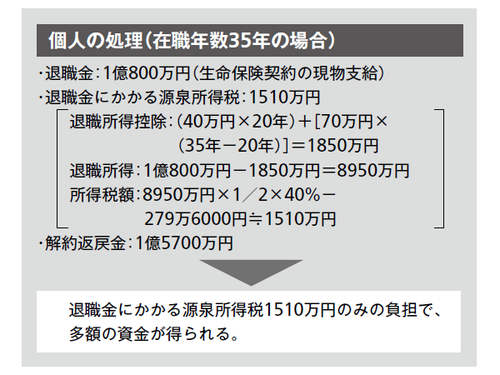 受け取った保険契約は通常の退職金同様、退職所得控除が適用された上、2分の1の課税となります。そのため、たとえば在職年数が35年の場合、退職金にかかる所得税は約1510万円で済みます。翌年になると、解約返戻率が上昇して返戻金は1億5700万円に跳ね上がるので、このタイミングで保険契約を解約すればよいのです。この結果、得られる1億5700万円の退職金に対して、税負担は1510万円と、大変低く済みます。