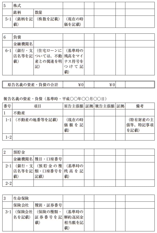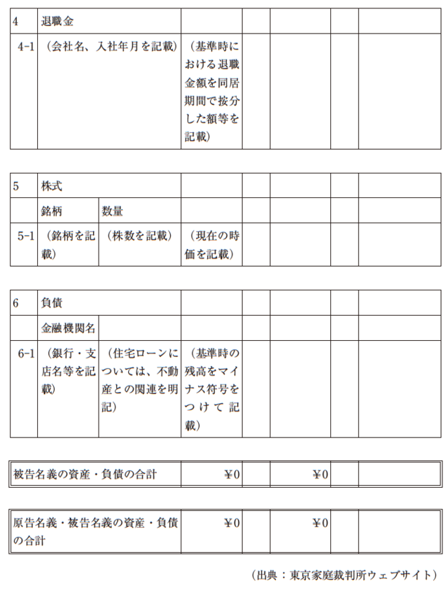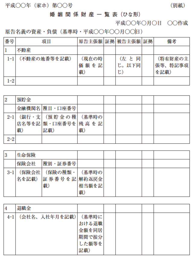 東京家庭裁判所では、財産分与が争点となっている場合、婚姻関係財産一覧表の提出が求められる。婚姻関係財産一覧表のひな形は、裁判所のウェブサイトで入手することができる。