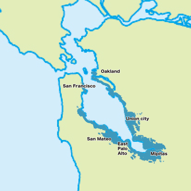 ノースベイではノバト、バレホが。ペニンシュラではサンマテオが。サウスベイ(シリコンバレー)ではパロアルト、イーストパロアルト、オルビソ(サンノゼの北)、ミルピタスが頻繁に浸水する可能性があるようです。