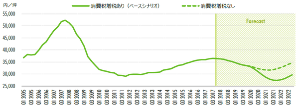 第二に、2020年の東京オフィス市場では2018年を上回る新規供給が予定されていることである。現在の予想では、グレードA賃料につき、2017年末から2020年末までで2割程度の賃料下落を予想している。ただし、消費税の増税が延期された場合は、賃料の下落幅は10%強にとどまると試算される。