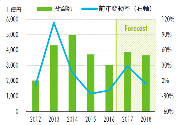 引き続き、日本の不動産市場に対する関心は高い。しかし、都心のプライム物件を中心に、相変わらず売り物件は少ない。また、エリアやアセットタイプによっては賃料の見通しに対する不透明感が高まっているため、売り手と買い手との間の価格目線のギャップも広がりつつある。そのため、2018年の投資総額は、2017年に比べてやや減少するものと予想される。